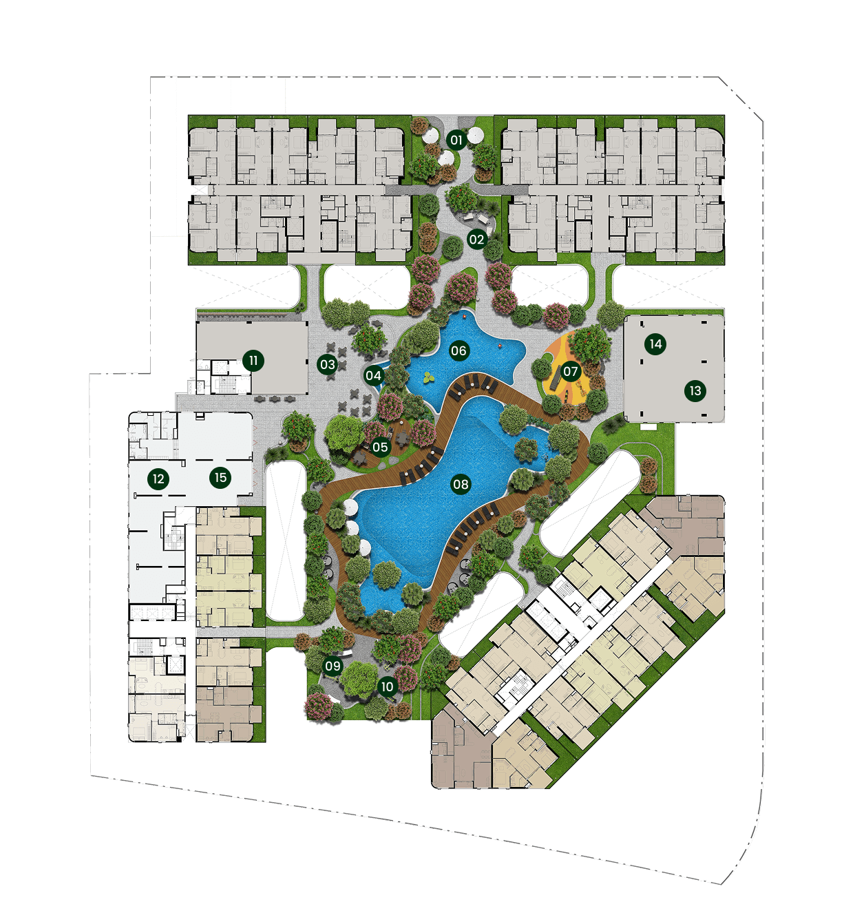 Khu cảnh quan thiền định với lối dạo bộ dưới tán cây, vườn thư giãn và mặt nước trong lành giúp tâm trí tìm lại sự tĩnh tại, an nhiên.